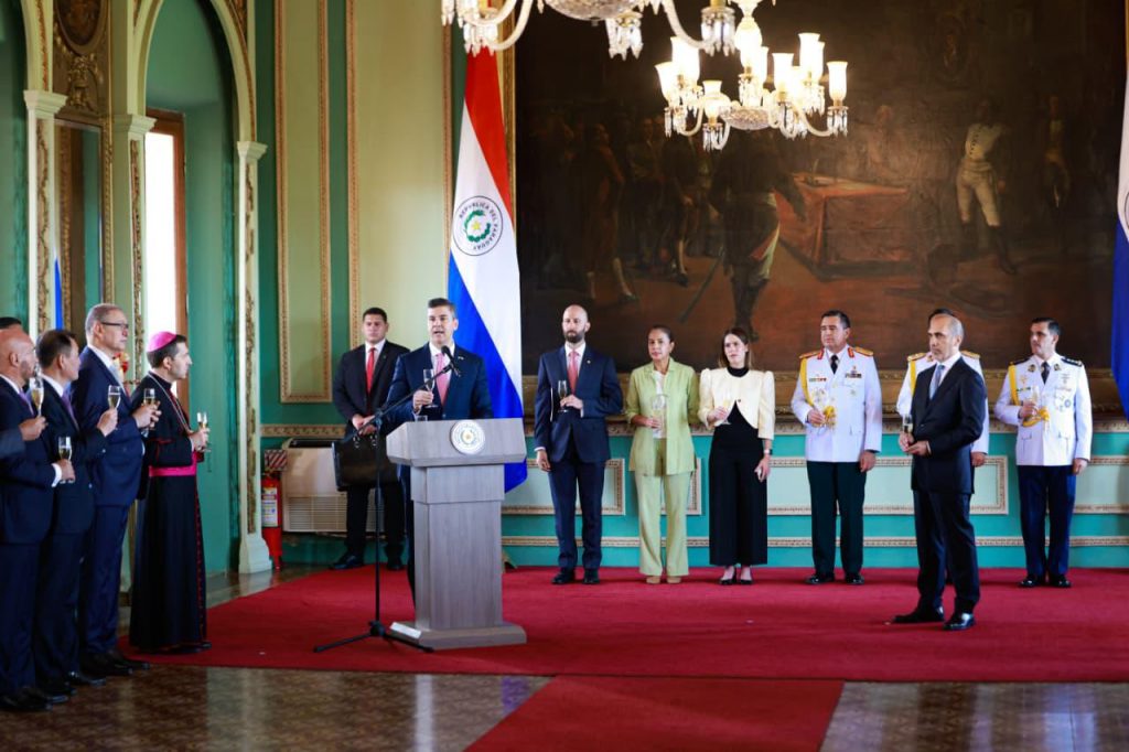 El Presidente de la República, Santiago Peña, encabezó el saludo del Cuerpo Diplomático y de los organismos internacionales acreditados en el Paraguay con motivo de las fiestas de fin de año, ocasión en la que realizó un balance del año en materia de política exterior, crecimiento económico y políticas sociales.